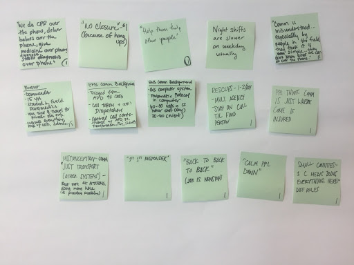 At the end of synthesis, we came up with several themes to target Communications medics, Field medics, and overall themes for both. With this in mind, our next step was to begin concepting & prototyping.